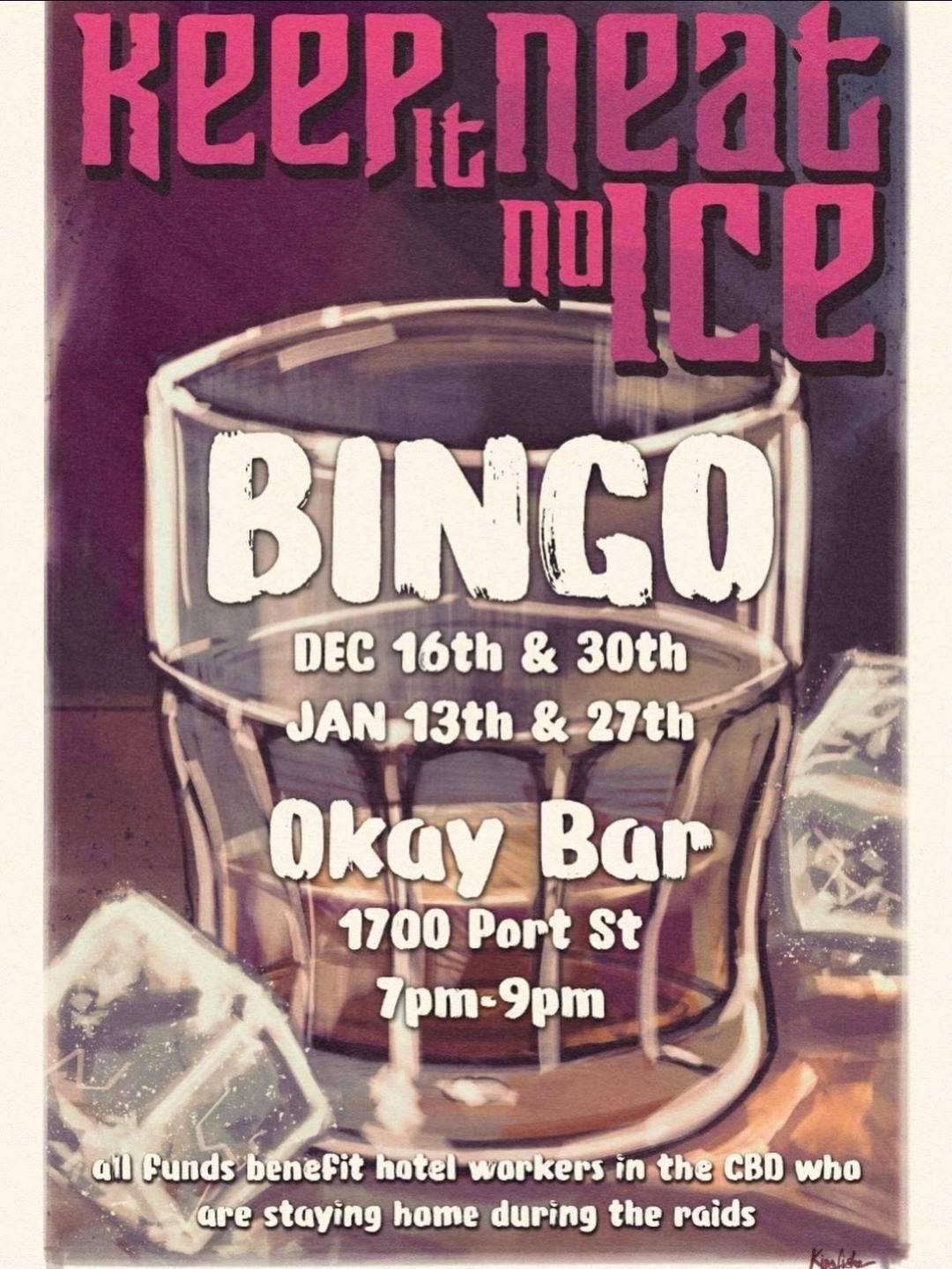 Join us for Bingo at Okay Bar every other Tuesday, 7–9pm. Come play a round, maybe win a prize, while helping support folks sheltering in place.