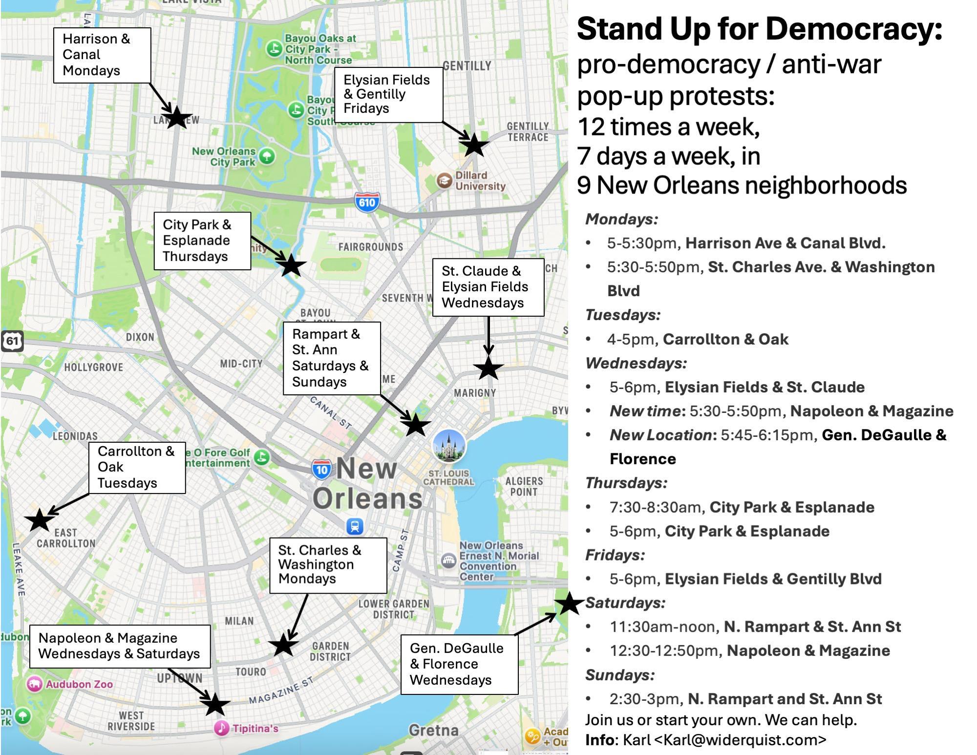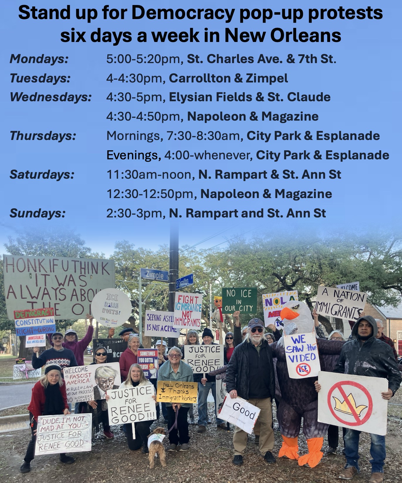 The Stand Up For Democracy neighborhood pop-up protests are a familiar and inspiring presence across New Orleans. What began quietly, with two groups separately demonstrating on Carrollton and on Napoleon, grew into a city-wide movement. One neighborhood sparked another, and soon the protests spread organically across town. These pop-ups exist to fill the space between large, scheduled demonstrations. They keep the fire alive when headlines fade. By showing up again and again, the protestors remind their communities that no one is alone in caring about democracy.