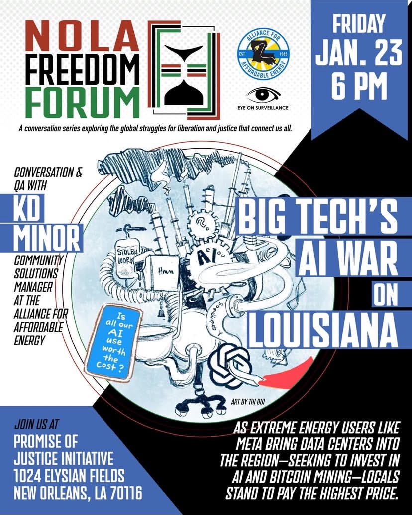 Come learn about Big Tech in our backyard at the NOLA Freedom Forum. Meet at Promise of Justice Initiative, 1024 Elysian Fields, at 6pm on Friday (1/23).